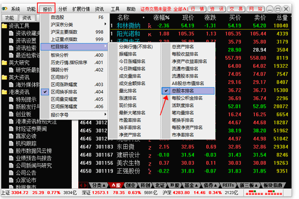 6、想要了解股票的综合排名,可以选择菜单栏“报价”里的“总股本排名”,可以对不同市场前六只股票进行综合排名,显示了涨幅、跌幅、震幅、涨速、跌速、量比、委比、总金额等9个指标。方便用户对异动股票的全面关注。为了动态看盘,设计“综合排名窗口”浮在分析图上,可以随意拖动;双击“综合排名窗口”中的任意股票,背景就会显示相关的分时走势图。在综合排名中可以使用右键菜单选择查看不同的市场信息,同时可以按“3行3列”或“1行4列”的方式选择查看的方式。