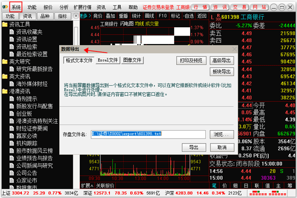 4、对于某些用户来说。可能需要对股票行情的原始数据做进一步的分析。这时候只要点击菜单栏“系统”的“数据导出”功能,系统就可以将当前屏幕数据导出到一个格式化文本文件或图形文件中,可以在其它排版软件(如Word)或统计软件(如Excel)中进行处理。利用其提供的计功能。做横向的分析比较和数据的处理。格式文本文件和Excel文件可以用来下载数据在艾件里面分析和处理。图形文件指的是媲经和分时图下载和分析。可以选择当前屏幕数据和所有数据。