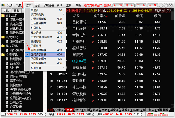 5、如果想来了解换手率的排名,可以点击“报价”的“区间换手率排名”,能在指定的时间内板块股票换手率排名,统计该时间段该板块各股票的换手率情况,与参照股票或者参照指数排序比较。区间和参照股票均可自定义。