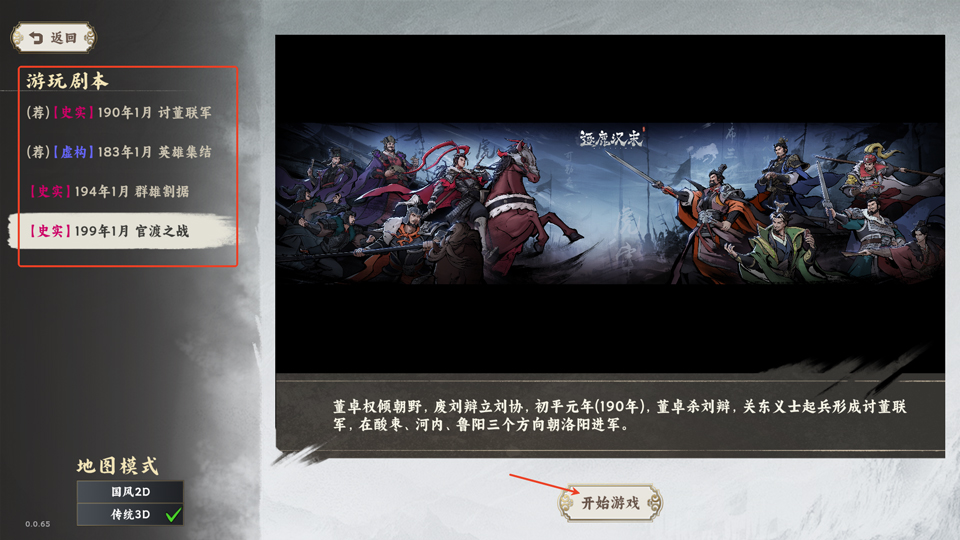 2、选择游玩剧本,如讨董联军、英雄集结、官渡之战等,还可以选择地图模式,之后开始游戏即可;