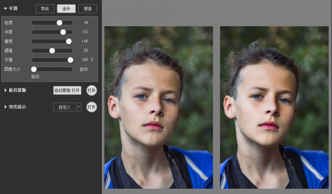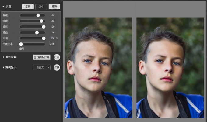 增强预设,采用了高数值的轻度、中度、重度参数设置,因此能达到更强的磨皮效果,达到更光滑细腻的磨皮效果,适用于较多瑕疵的人像处理,但相对的,细节损失会更多。