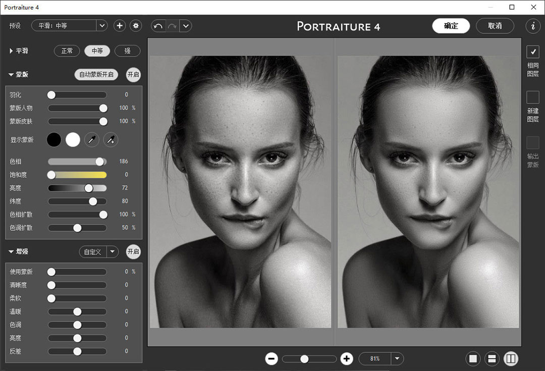 3、强大的蒙板工具,仅在图像的肤色区域中进行选择性平滑。