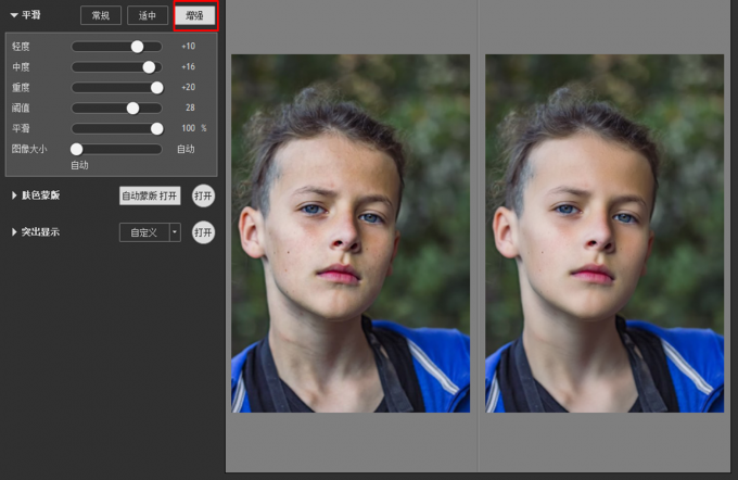 常规预设,主要是进行大范围的磨皮处理,对于小范围的瑕疵采用轻度的磨皮处理,因此能保留一定的皮肤瑕疵细节,让效果更为自然。