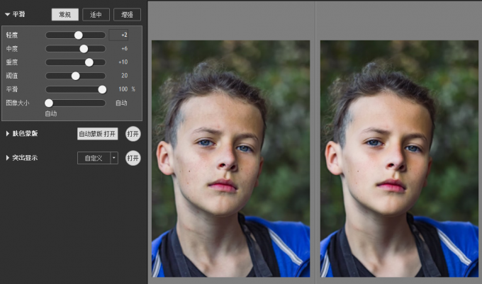 完成对比视图的调整后,即可开始微调磨皮效果。先进行平滑参数的设置,根据磨皮强度的需求,选择平滑预设效果,本例选择了强度最强的“增强”预设。对比原图,人像皮肤细腻度提升,脸上的小瑕疵也一并清除了。
