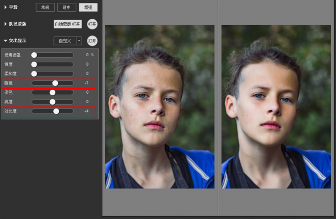 接着,根据人像特点调整色彩、亮度等增强参数。在本例中,增强了暖色(偏红效果),以及对比度,让人像的轮廓更加深邃。