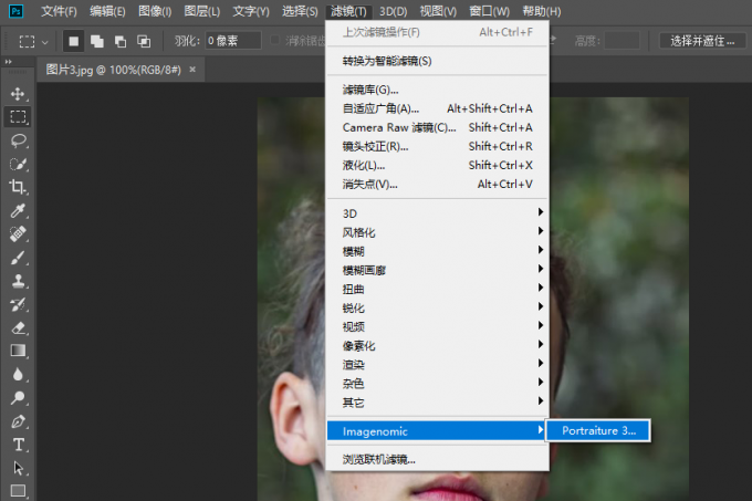 首先,在ps中导入一张人像图片后,依次点击滤镜-imagenomic-portraiture 3,启动portraiture磨皮插件。