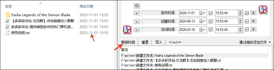 5、确认文件和目标时间都设置无误后,点击软件界面左中部的 “更新时间” 按钮。软件会立刻执行操作,最后你还可以看查看文件时间,看看是否已经变成了你设定的新时间。