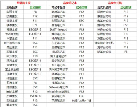 在电脑上插入系统安装 U 盘,重启电脑,在开机后的几秒内,连续按下快捷键直至进入 BIOS 启动选项界面,并选择该 U 盘。请根据自己的电脑选择相应的快捷键,常见的电脑和主板进入 BIOS 的快捷键如图(仅供参考):