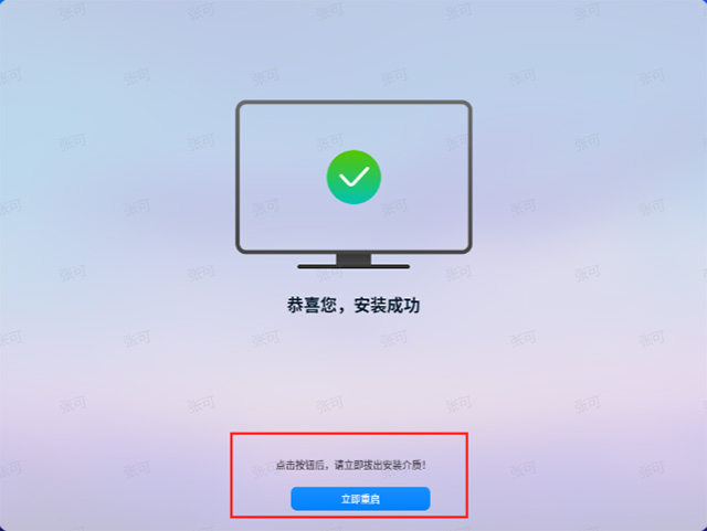 需要注意,不管是“全盘安装”还是“自定义安装”,在系统安装成功的时候,单击【立即重启】后需要立即移除U盘。(安装界面有提醒!)