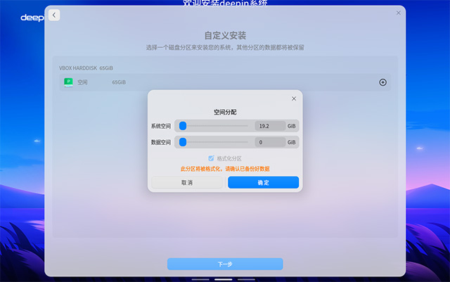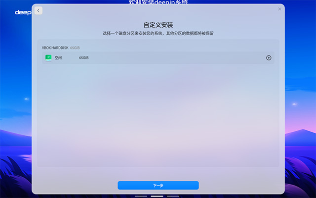 在进行自定义安装前,请先在电脑上准备好安装 deepin所需的磁盘空间(至少65G以上),关于如何在电脑上进行磁盘分区,这里不再详细展开。