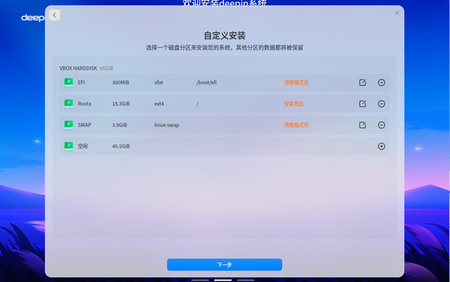 2、自定义安装:可以自定义系统各分区的大小,可以实现 deepin 和 Windows 双系统。