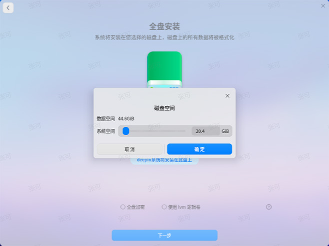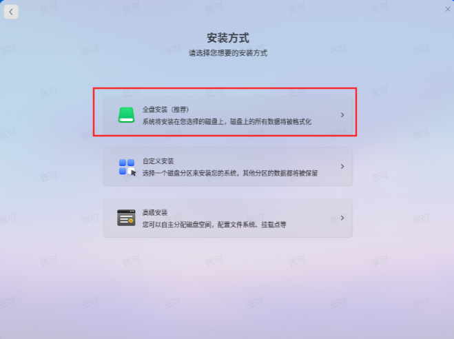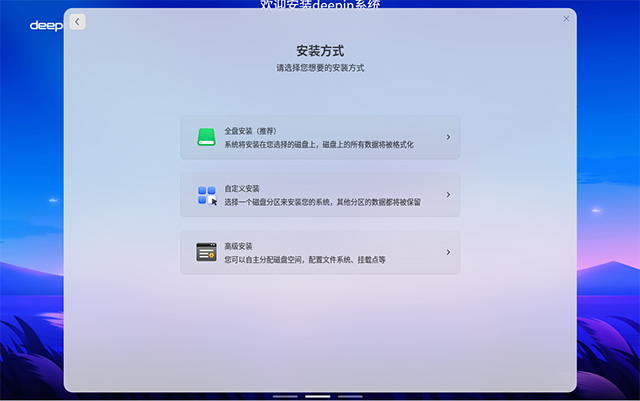 1、全盘安装:安装后只保留 deepin 系统(电脑只有一块硬盘的情况下,会格式化整块硬盘)。