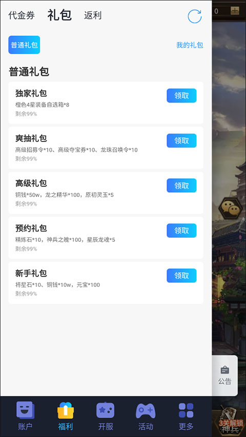 2、切换到礼包栏,我们选择领取普通礼包兑换码。