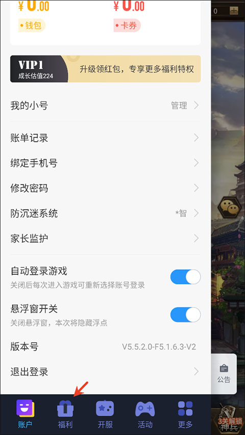 1、进入游戏内选择小弹窗,再选择下面的福利。