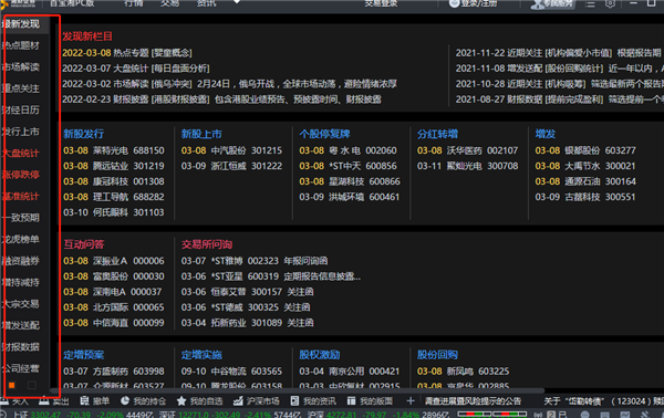 5、点击发现,我们可以看到有近期发现、市场解读、热点题材、重点关注、基准统计、涨停跌停、大盘统计、龙虎榜单等等资讯信息;