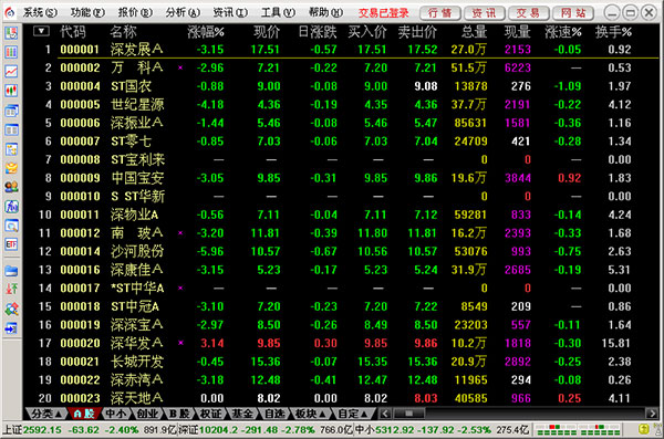 进入太平洋证券通达信合一版后,屏幕上首先出现行情显示窗口,列表显示最新股票交易行情。窗口顶部是主菜单条。注意,主菜单条的右端有两组按钮,分别控制系统窗口和其子窗口的最小化、层叠/还原、关闭。该系统支持整屏放大功能,整个界面就像在DOS下一样。