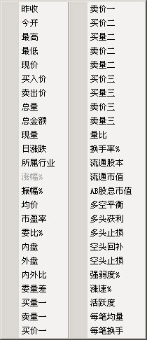 要想更换某一栏的内容,请用鼠标右键点击其栏目名称,然后从弹出菜单上选择新栏目。例,右键点击『现价』栏,弹出菜单后,找到『市盈率』,左键点击它,则该栏目内容换成市盈率。