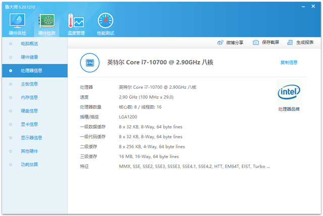 3、硬件检测:可以查看电脑概览,硬件健康,处理器信息,主板信息,内存信息等;