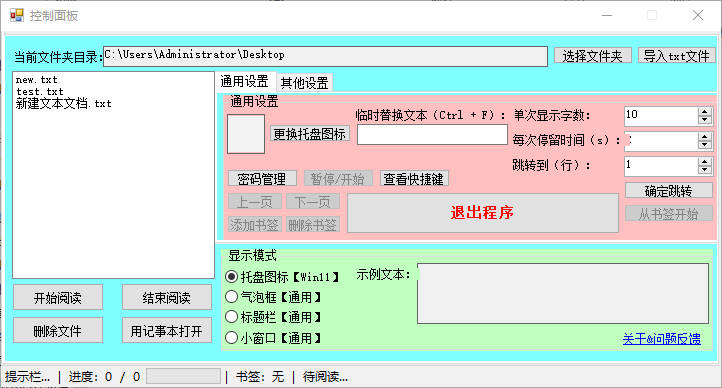 软件还提供了丰富的功能,比如自定义托盘图标(建议使用游戏风格的.ico格式图片),添加书签,调节阅读速度和字数等。它支持三种阅读模式:托盘图标模式、气泡框模式和标题栏模式,其中托盘图标模式仅适用于Win11系统。