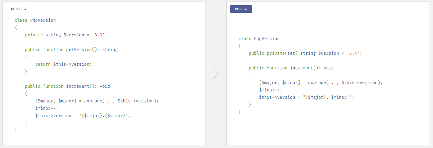 现在可以独立地控制写入属性的作用域和读取属性的作用域,减少了需要编写繁琐的 getter 方法来公开属性值而不允许从类外部修改属性的需求。