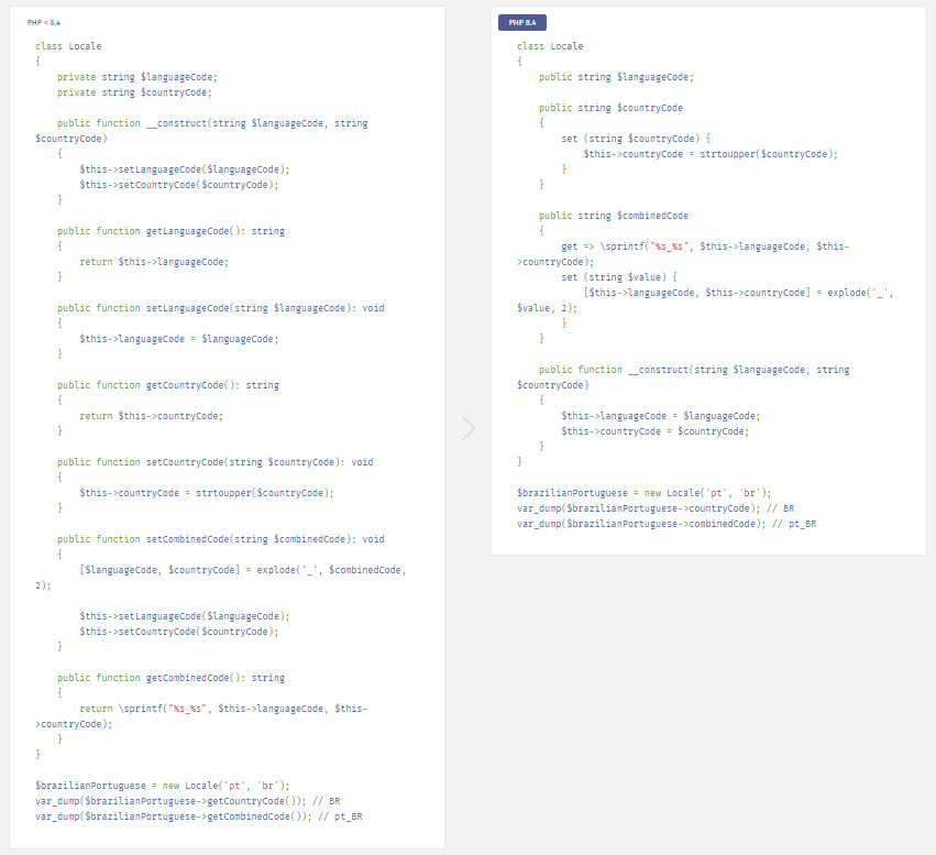 属性钩子提供对计算属性的支持,这些属性可以被 IDE 和静态分析工具直接理解,而无需编写可能会失效的 docblock 注释。此外,它们允许可靠地预处理或后处理值,而无需检查类中是否存在匹配的 getter 或 setter。