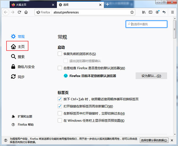 3、进入主页设置页面后可以看到右侧“主页和新窗口”中显示目前设置的主页是火狐主页的网址。