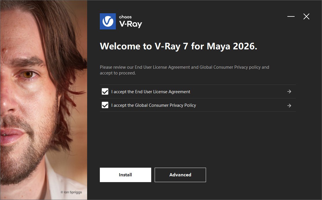 2、以2026版为例,双击文件vray_adv_71000_maya2026_x64.exe开始安装,接受协议,点击Advanced;