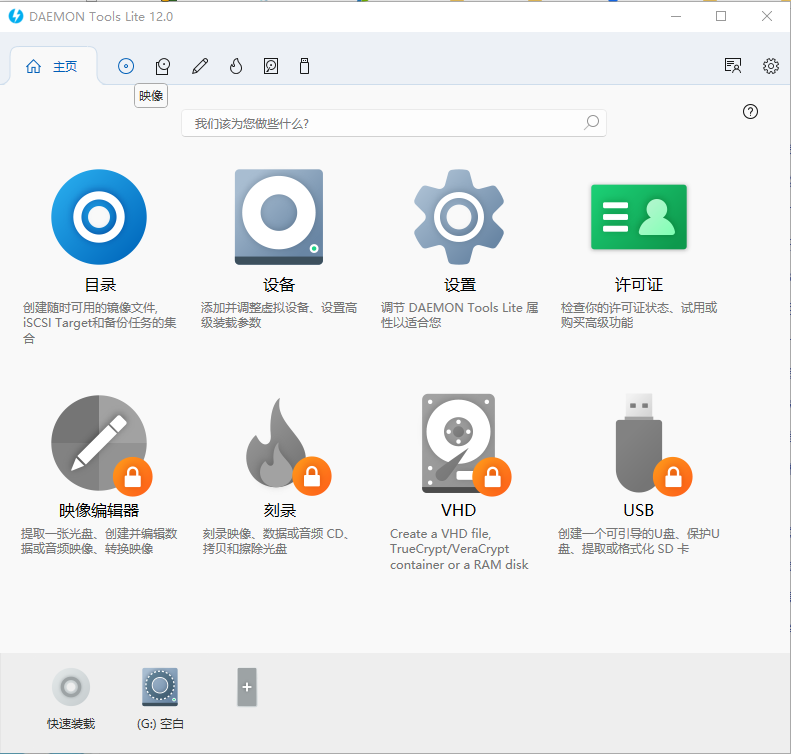 1、打开虚拟光驱精灵软件,进入主界面,包括【主页】、【映像】、【设备】、【映像编辑器】、【刻录】、【VHD】和【USB】等功能选项,