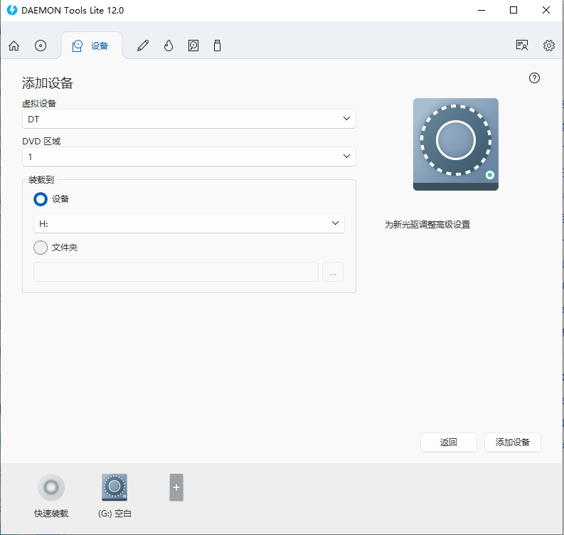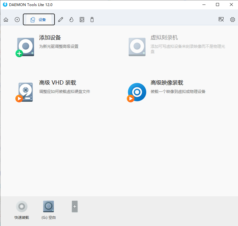 3、进入【设备】界面,支持添加设备、虚拟刻录机、VHD装载和高级映像装载等功能,