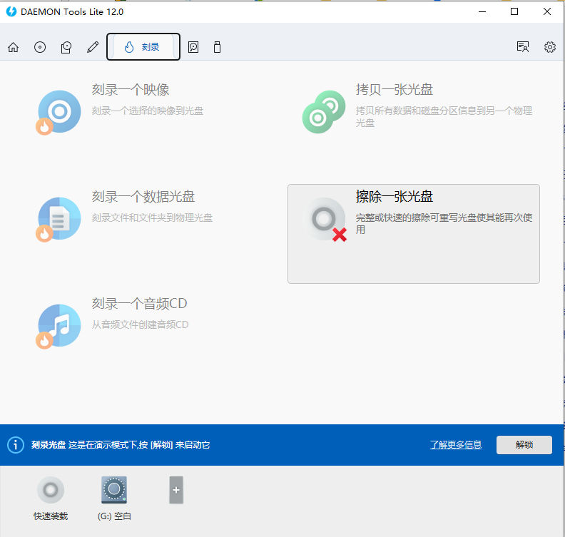 5、进入【刻录】界面,可进行刻录映像、拷贝光盘、刻录数据光盘、擦除光盘和刻录音频CD等操作,