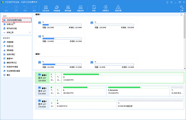 1、打开软件,在主页面选择“迁移系统到固态硬盘”(注:此功能也能用来迁移系统到普通的机械硬盘)。按照程序指示进行操作。