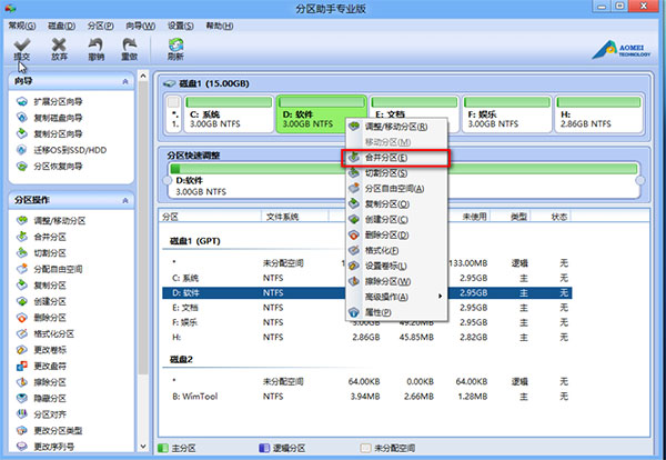 2、打开分区助手之后,选中一个你想合并的分区,右键单击,在弹出的菜单中选择合并分区: