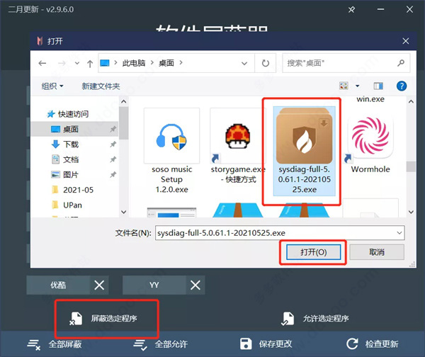 5、我们只需要点击屏蔽选定程序,然后选择一下需要屏蔽的软件安装包文件。