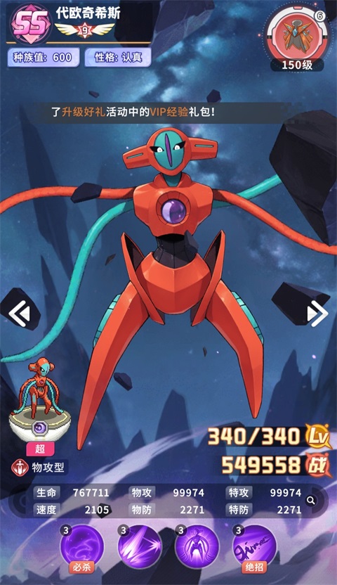 集中精神和宇宙共鸣。攻击形态:对生命最低的3个敌人造成122%物攻的物理伤害,并附加【宇宙爆炸】3回合;防御形态:对攻击最高的3个敌人造成122%物攻的物理伤害,并附加【宇宙回响】3回合。