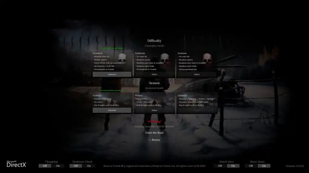 在《通往沃斯托克之路》中,建议选择标准难度和夏季开始游戏。