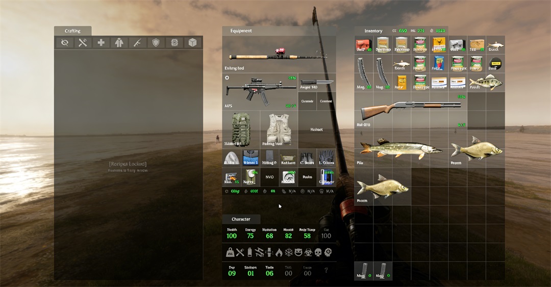卸下你的MP5或霰弹枪,将鱼竿放入主武器槽。这些枪械的数值数据仍保留在武器维基中。抛竿机制相当硬核:你需要通过鼠标控制抛竿力度和角度。准星瞄得越高,鱼线抛得越远。抛出后,鱼线会缓慢漂回你的位置。当鱼线穿过水下方块时,若该方块内仍有鱼,鱼便会自动上钩。这里没有复杂的QTE战斗机制——只需找到正确的方块,耐心等待鱼线收线即可。