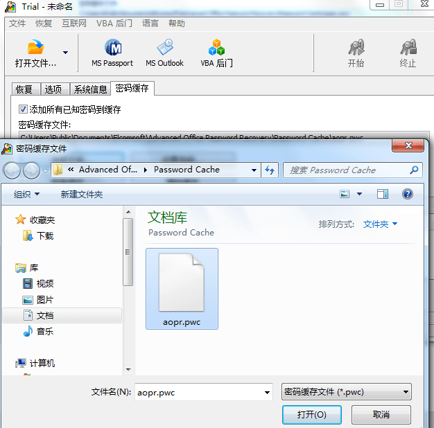 3.在弹出的添加文件对话框中,选择需要的.pwc文件并单击“打开”按钮,添加缓存文件成功