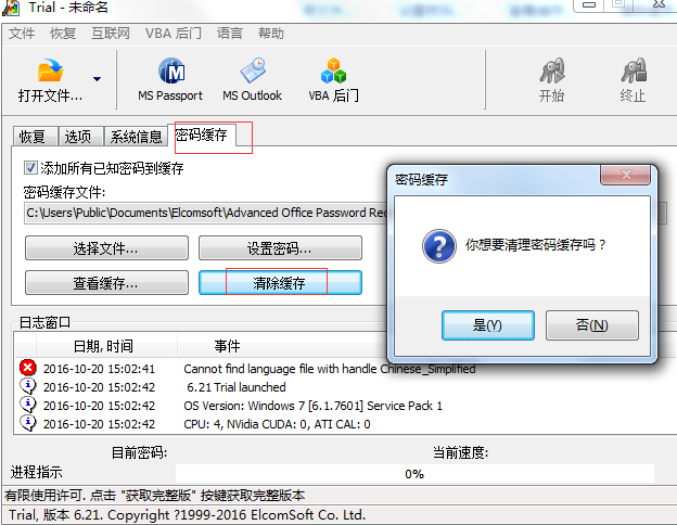 在AOPR的密码缓存区域,直接用鼠标点击 “清除缓存”按钮,就会弹出“你确定清除密码缓存”的对话框,点击“是”,就可以将所有保存在密码缓存中的密码进行清除。值得注意的是:此项操作需要谨慎,一旦清除将不可恢复。为了能更快地破解密码,一般是不建议清除缓存的。