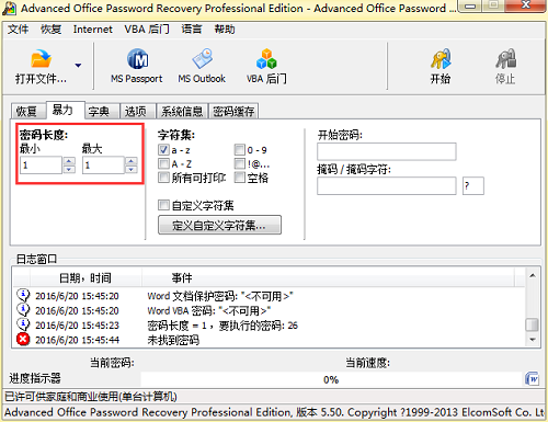 既然已经知道导致“未找到密码”错误产生的原因了,只要更改Advanced Office Password Recovery 5.50暴力破解的破解设置即可解决该问题,比如据对密码的记忆更改密码位数,但是确保最大位数大于最小位数。