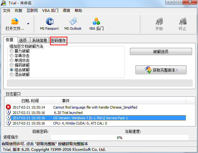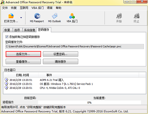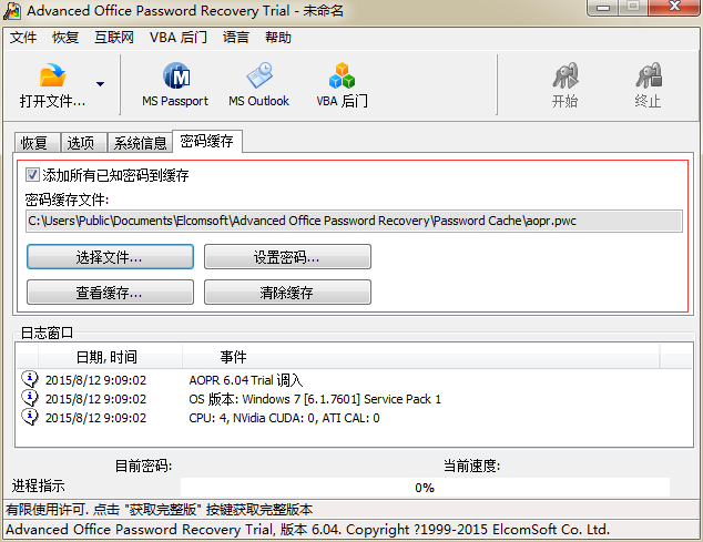 “密码缓存区”是指在AOPR中设有一个专门用来存储密码的区域,保存密码破解过程中发现的所有密码。这些密码均以Unicode格式保存,所以包含国际字符的密码也可以保存其中。用户可以为“密码缓存”设置密码,密码采用RC4加密算法加密,并且还有安全哈希算法验证密码的正确性。
