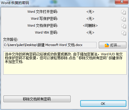 安装好密码破解工具后,就会在桌面上出现软件快捷图标,用鼠标双击AOPR图标打开软件,单击左上角的“打开文件”按钮,找到要破解密码的Word文档,点击打开,软件就会自动对文档进行分析,从而开始破解文档的保护密码。破解完成后,会弹出如下图所示的Word恢复的密码对话框,提示可以将Word文档保护密码删除,而且提示“由于强加密算法,Word文档保护密码不能恢复,但是可以被轻易移除”。既然找不到密码,就可以利用AOPR将密码移除,这样就可以对文档进行编辑