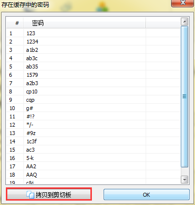 2、这样就会弹出如下图所示的对话框,显示出了所有存在在缓存中的密码,通过右侧的下拉键可以查看更多的密码。如果觉得这些密码有参考意义,可以点击左下角的“拷贝到剪切板”复制下来进行保存。如果不需要复制,直接点击“OK”,就可以关闭该对话框