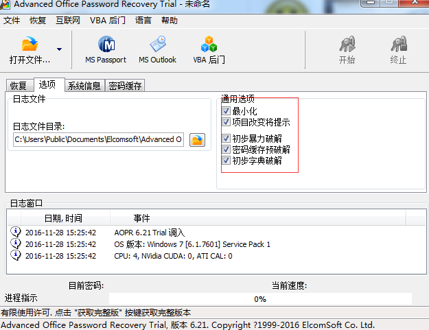一般情况下,通用选项下的几个勾选都是全部勾上的,这样有利于在破解密码时使用合适地方法快速的找回密码。因为在破解密码时,弹出提示对话框是很有必要的,这将有助于你决策下一步即将做什么。最小化功能是每个软件都配备的,方便在有的时候将窗口最小化,便于其它软件的使用。暴力破解和字典破解是两种比较常用的破解方式,在恢复密码的时候经常使用。