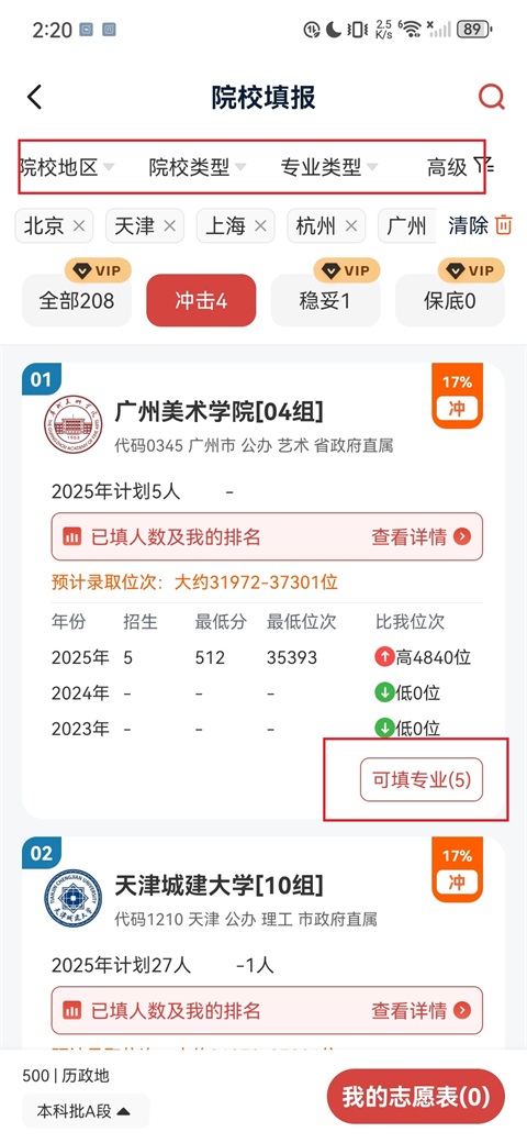 3、可通过顶部筛选栏(院校地区、类型、专业类型等)筛选目标院校,找到心仪院校后,点击"可填专业",进入专业选择页;