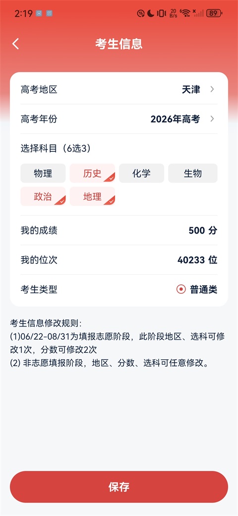 1、进入APP,在"考生信息"页面,填写/确认"高考地区、年份、选科、成绩、位次"等信息,点击"保存"完成基础信息设置;