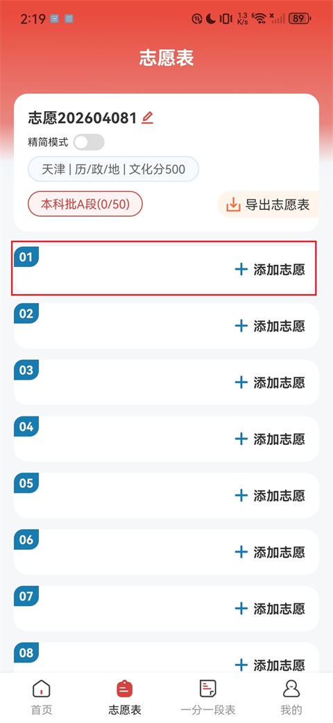 2、切换到底部"志愿表",点击对应志愿栏(如01栏)的"+添加志愿",进入"院校填报"页面;