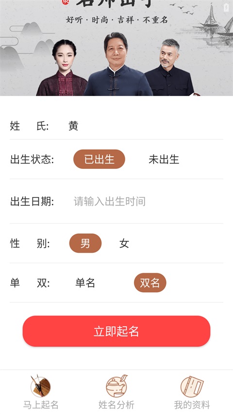 1、用户进入APP点击取名,输入姓氏以及时间等情况;