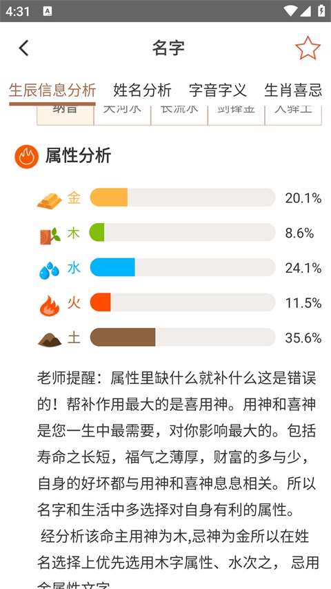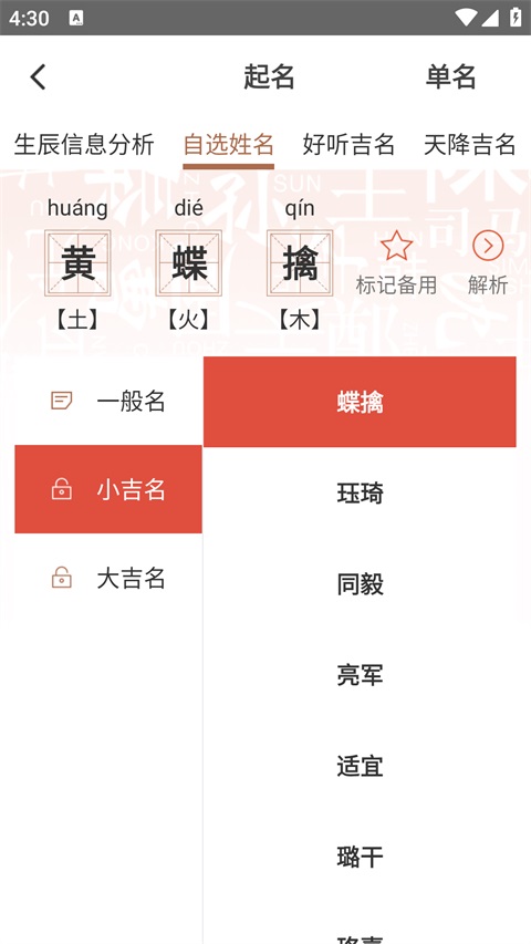 3、每一个姓名用户都可以点击查看姓名分析和生辰信息分析,最终根据需求进行选择起名即可。