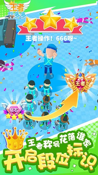 1、这是一款趣味性超强的休闲竞技小游戏。在游戏中,你扮演一方营地工程师(营地颜色任君选择吼),在地面趟板板的紫色砖块是材料,收集材料叠叠高到无法承受重力后,回营地建造,召集更多士兵战斗,并且不断壮大你的队伍。再不断收集弹药把中央炮车填满,中央炮车成为我们战力后,会为你赢得80%的胜率;这时,你只需要将敌人引入圈圈,剩下就是坐等王者称号的到来。2、在这里你可以选择猥琐发育,开局先让其他阵营互相残杀,坐等渔翁之利。也可选择痛扁你的对手,不断变强,抢先占领中央炮车高地,傲视群雄。