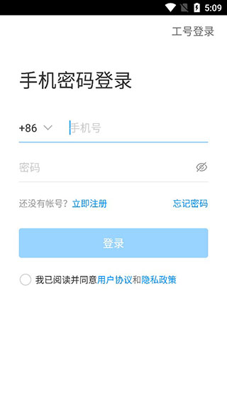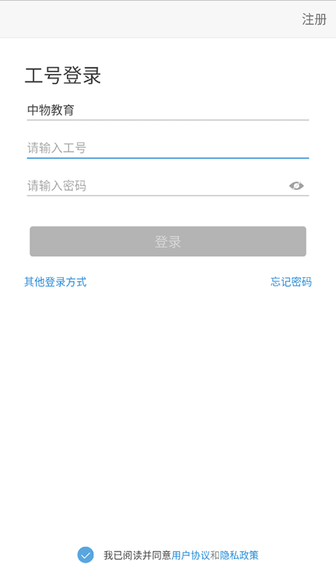 1、打开中物教育官方版,新用户需要使用实名验证的手机号码进行注册登录。